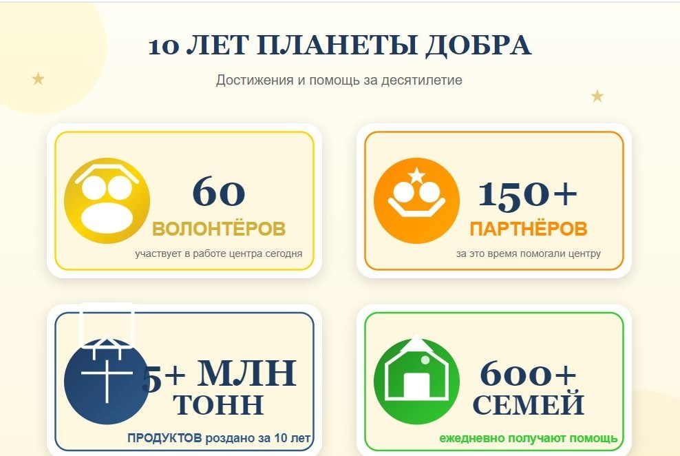 Более 600 семей ежедневно получают помощь. Каждый день мы работаем для того, чтобы ни одна семья не осталась без поддержки.Но эти цифры — это не просто достижения. Это истории конкретных людей: многодетных мам, которые смогли накормить детей; детей, чьи мечты сбылись благодаря вам.Спасибо каждому, кто был рядом все эти годы!Спасибо нашим волонтёрам — тем, кто тратит своё время и силы.Спасибо партнёрам — тем, кто помогает ресурсами и возможностями.Спасибо жертвователям — тем, кто вкладывает частичку своего сердца.Спасибо подопечным семьям — тем, кто учит нас стойкости и любви.Это наше общее достижение. И мы уверены — вперёд нас ждёт ещё больше добра!Планета добра — потому что вместе мы можем изменить мир.